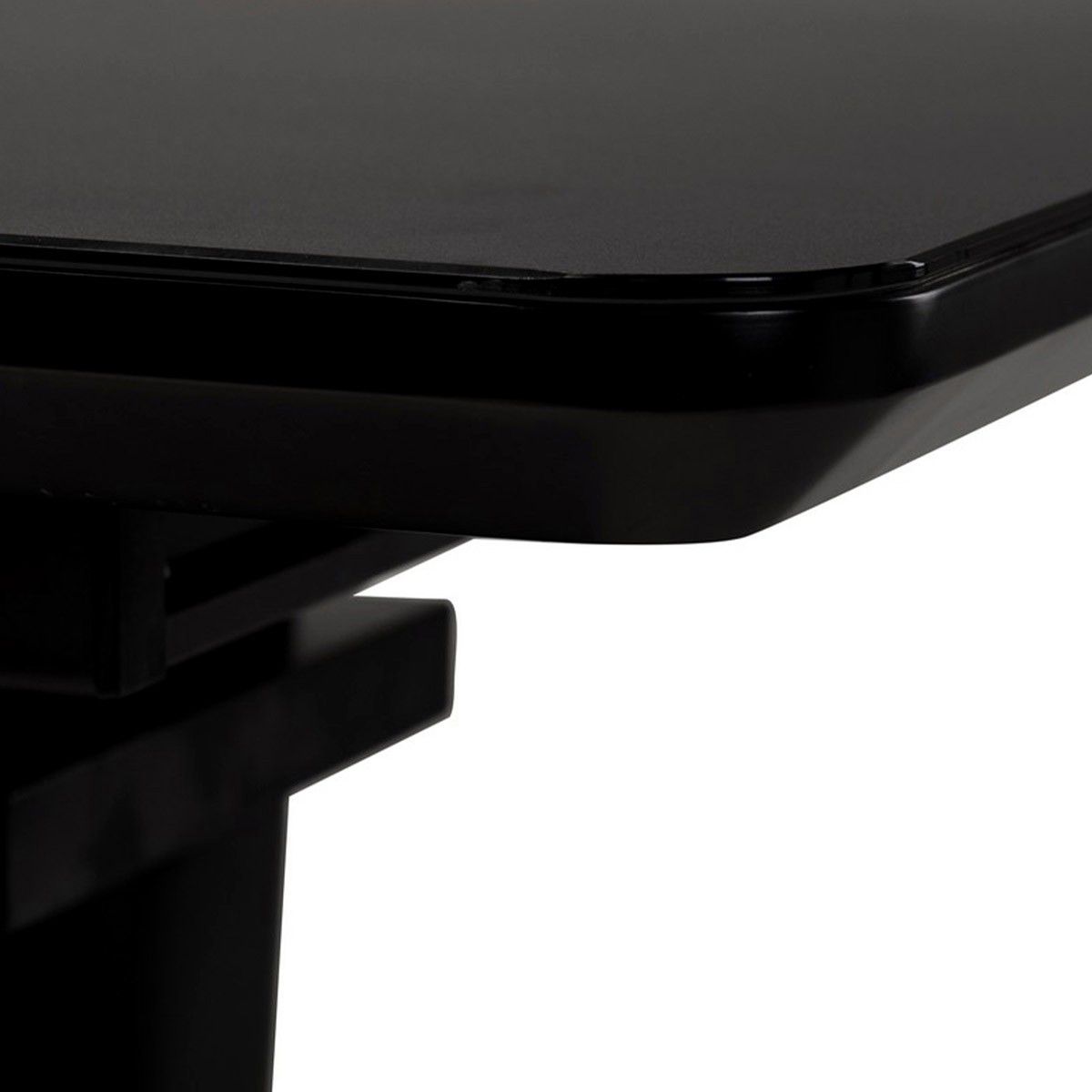 Designový jídelní rozkládací stůl o rozměru 110 + 40 x 75 cm. Vrchní stolová deska je tvrzeného skla tl. 4 mm v černé barvě. Díl rozkladu je také krytý černým sklem jako celá stolová deska, což nepatří ke standardům a řadí stůl do vyšší kategorie. Podkladová deska, centrální noha je z MDF ve slušivé černé matné barvě. Podesta je z také z MDF a krytá černým sklem. Ze spodní části opatřená plastovými kluzáky, eleminujícími poškození povrchů tvrdých podlah. Mechanické součásti jsou kovové. Stůl jistě zaujme svým nadčasovým designem i skvěloým zpracováním detailu a v neposlední řadě i barvou a stane se elegantním prvkem v moderních i klasicky laděných jídelnách, kuchyních a obývacích prostorách. Výška stolu je 76 cm. Ke stolu je možné umístit až 6 židlí.