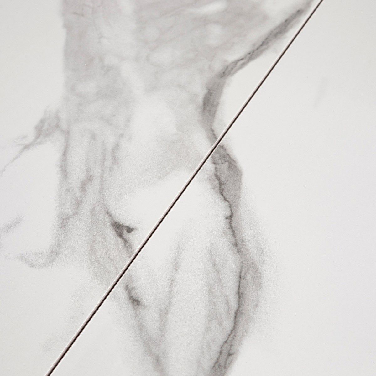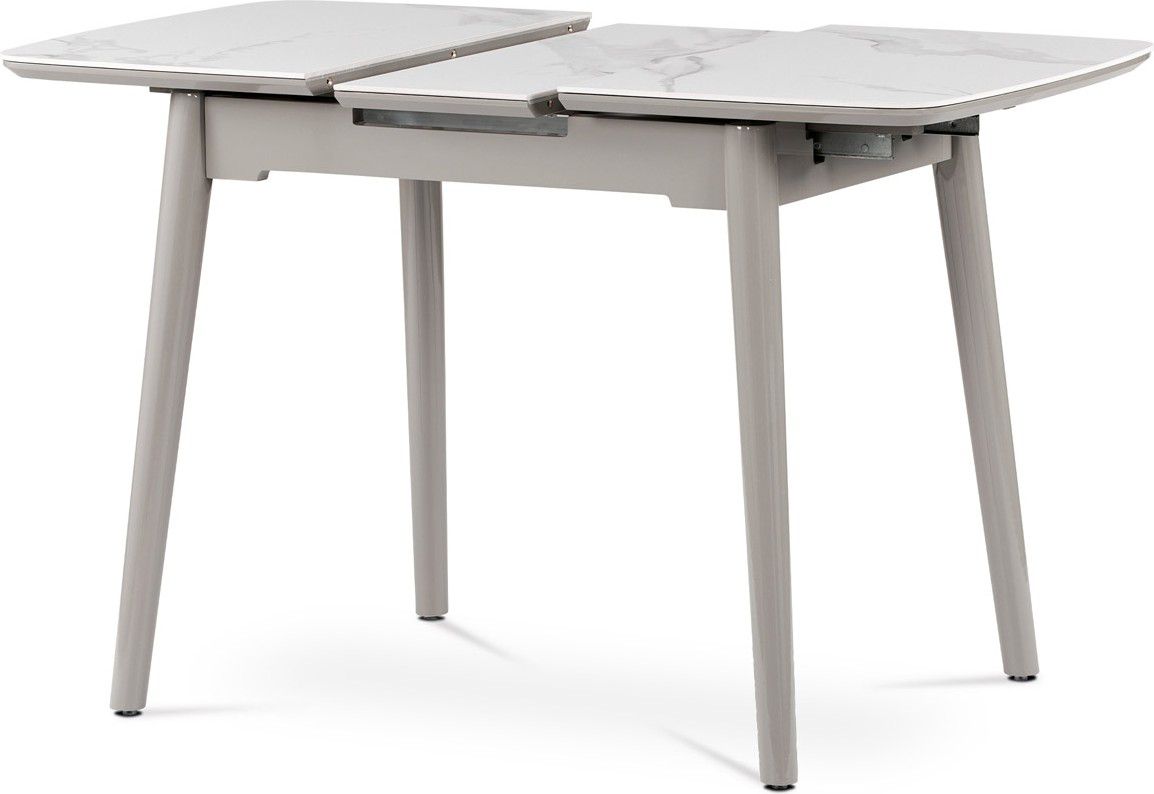 Jídelní rozkládací stůl o rozměru 110 + 30 x 70 cm z masivního dřeva, MDF konstrukčních prvků a výrazné stolové desky z lesklé tvrzené keramiky tl. 6 mm v dekoru bílý mramor s jemnou šedočernou kresbou. Nohy jsou kruhového průřezu a z masivního bukového dřeva, ukončené plastovými kluzáky, zabraňující poškození tvrdých povrchů podlah. Ostatní konstrukční prvky jsou v kombinaci masivu a MDF. Výška stolu je 76 cm. K rozloženému stolu je možné umístit až 6 židlí. Rozkládání je ve středu stolu a výsuvné. Díl je široký 30 cm a keramickou deskou ve stejném dekoru. Mechanika je celokovová. Stůl jistě zaujme svým minimalistickým stylem, netradiční skladbou materiálů, ale i skvělou kresbou dekoru mramoru a v neposlední řadě i barvou konstrukce v šedém vysokém lesku. Velkým bonusem je velikost stolu, proto se výborně hodí a bude i elegantním prvkem v menších moderních a klasicky laděných jídelnách, kuchyních a obývacích prostorách. Pro tento stůl platí - složený jsem zcela ideální do menších bytů a při rozložení obsloužím nejen začínající rodiny. Designově jsem velmi zajímavý a moje konstrukce a keramická deska s kresbou mramoru je velmi pevná a odolná :-).