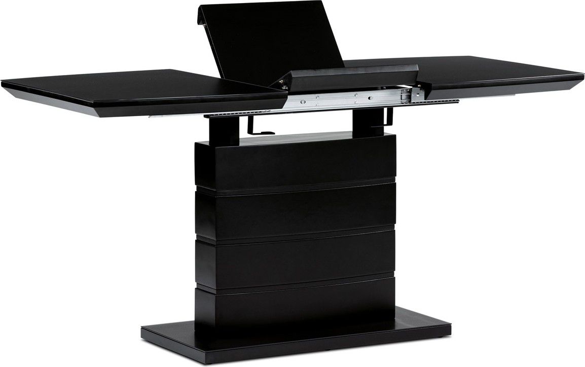 Designový jídelní rozkládací stůl o rozměru 110 + 40 x 70 cm. Vrchní stolová deska je tvrzeného skla tl. 4 mm v černé barvě. Podkladová deska, centrální noha a díl rozkladu je z MDF ve slušivé černé matné barvě. Podesta je z také z MDF a krytá černým sklem. Ze spodní části opatřená plastovými kluzáky, eleminujícími poškození povrchů tvrdých podlah. Mechanické součásti jsou kovové. Stůl jistě zaujme svým nadčasovým designem i skvělým zpracováním detailu a v neposlední řadě i barvou a stane se elegantním prvkem v moderních i klasicky laděných jídelnách, kuchyních a obývacích prostorách. Výška stolu je 76 cm. Ke stolu je možné umístit až 6 židlí.