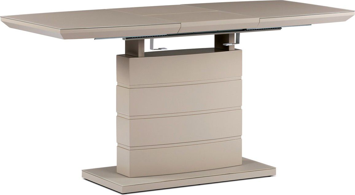 Designový jídelní rozkládací stůl o rozměru 110 + 40 x 70 cm. Vrchní stolová deska je tvrzeného skla tl. 4 mm v cappuccino barvě. Podkladová deska, centrální noha a díl rozkladu je z MDF v trendy cappuccino matné barvě. Podesta je z také z MDF a krytá sklem v cappuccino odstínu. Ze spodní části opatřená plastovými kluzáky, eleminujícími poškození povrchů tvrdých podlah. Mechanické součásti jsou kovové. Stůl jistě zaujme svým nadčasovým designem i skvělým zpracováním detailu a v neposlední řadě i barvou a stane se elegantním prvkem v moderních i klasicky laděných jídelnách, kuchyních a obývacích prostorách. Výška stolu je 76 cm. Ke stolu je možné umístit až 6 židlí.