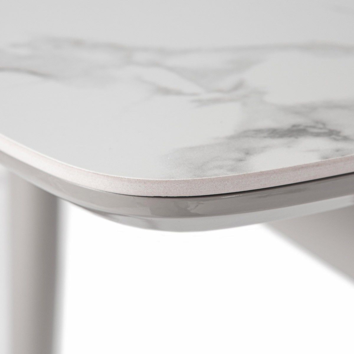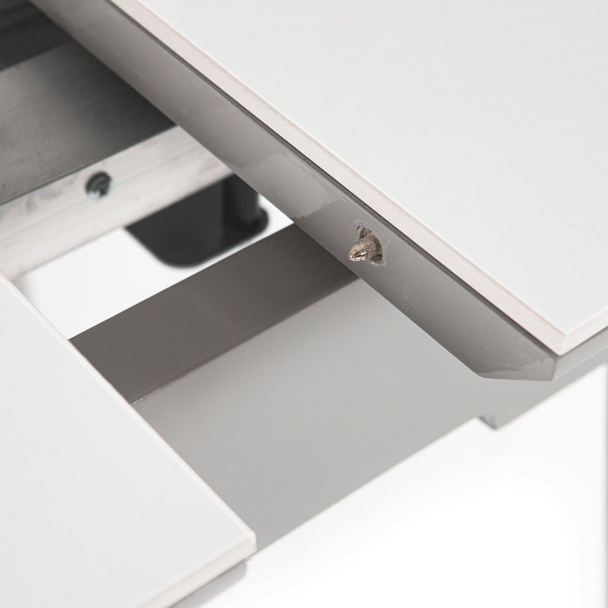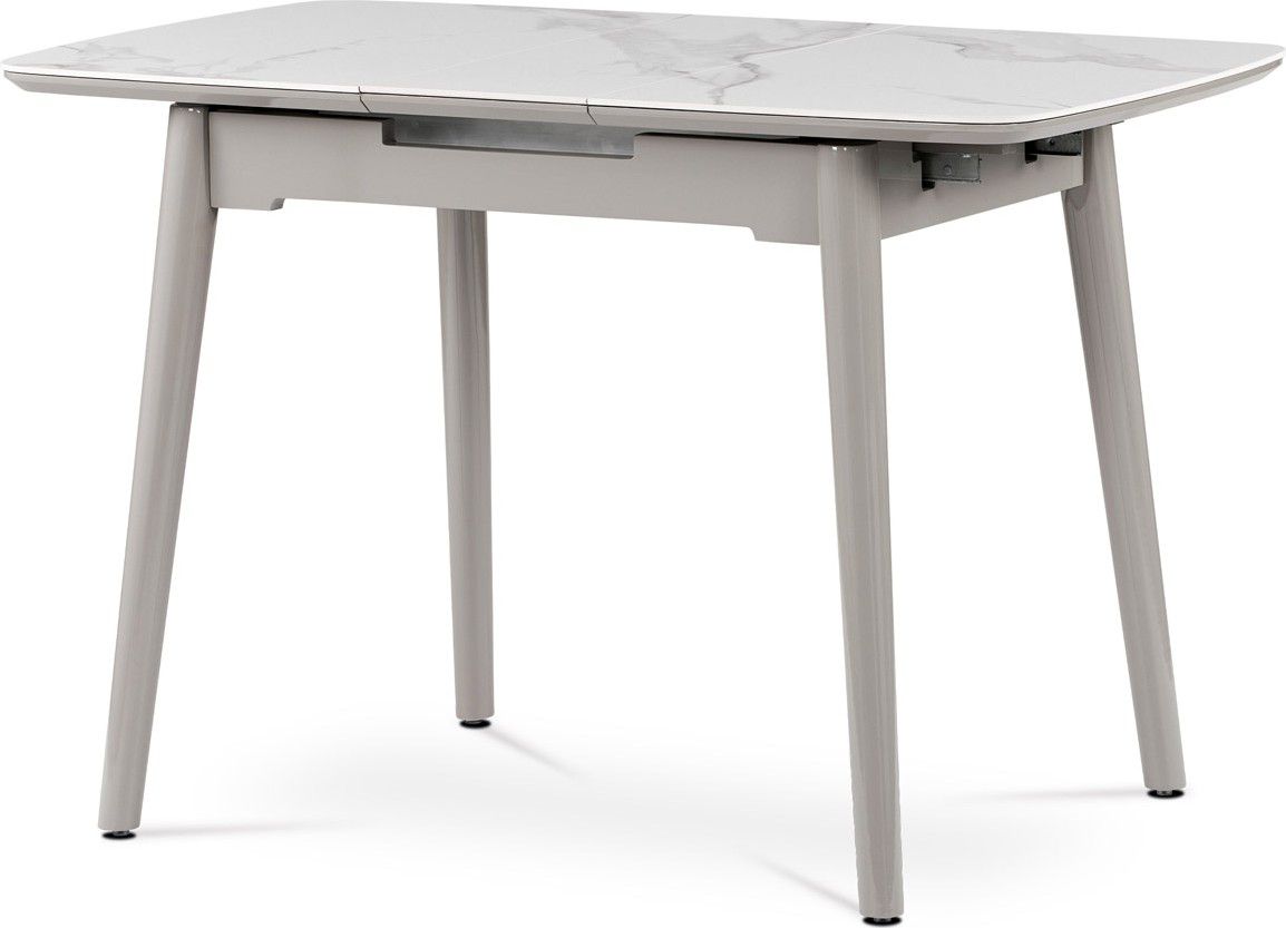 Jídelní rozkládací stůl o rozměru 94 + 25 x 78 cm z masivního dřeva, MDF konstrukčních prvků a výrazné stolové desky z lesklé tvrzené keramiky tl. 6 mm v dekoru bílý mramor s jemnou šedočernou kresbou. Nohy jsou kruhového průřezu a z masivního bukového dřeva, ukončené plastovými kluzáky, zabraňující poškození tvrdých povrchů podlah. Ostatní konstrukční prvky jsou v kombinaci masivu a MDF. Výška stolu je 76 cm. K rozloženému stolu je možné umístit až 6 židlí. Rozkládání je ve středu stolu a výsuvné. Díl je široký 25 cm a keramickou deskou ve stejném dekoru. Mechanika je celokovová. Stůl jistě zaujme svým minimalistickým stylem, netradiční skladbou materiálů, ale i skvělou kresbou dekoru mramoru a v neposlední řadě i barvou konstrukce v šedém vysokém lesku. Velkým bonusem je velikost stolu, proto se výborně hodí a bude i elegantním prvkem v menších moderních a klasicky laděných jídelnách, kuchyních a obývacích prostorách. Pro tento stůl platí - složený jsem zcela ideální do menších bytů a při rozložení obsloužím nejen začínající rodiny. Designově jsem velmi zajímavý a moje konstrukce a keramická deska s kresbou mramoru je velmi pevná a odolná :-).