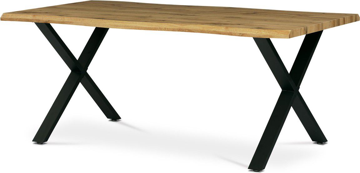Jídelní stůl z MDF materiálu v 3D dekoru. Kovové podnoží v černé práškové barvě v plochém profilu. Noha ve tvaru písmene "X"