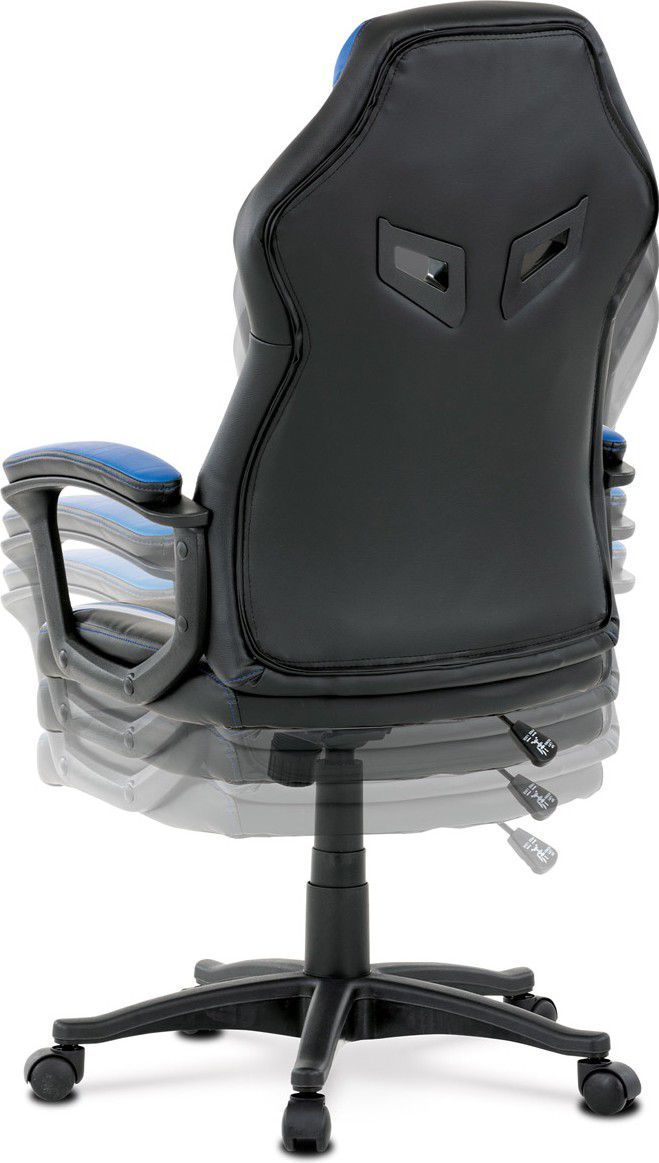 Elegantní herní židle v designu sedačky závodního vozu v provedení Dark Style se zaoblenými liniemi ve výrazném kontrastu s ostře řezanými rysy plastového lemování otvorů na „bezpečnostní pásy“. Tyto designové otvory v horní části opěráku nejen potřebný závodní vzhled, ale také usnadňuje manipulaci. Potah je kombinace modré a černé ekokůže. Obvodové prošití je v modrém odstínu. Polstrování je z kvalitní PU pěny. židle je vybavena houpacím mechanismem s nastavením protiváhy a aretací v základní poloze. Tuhost protiváhy lze regulovat velkým plastovým šroubem, umístěným pod sedákem. Výška sezení se upravuje páčkou na pravé straně přes kvalitní plynový píst. Ruce unavené z hraní si můžete pohodlně položit na plastové područky, na ložné ploše polstrované opět modrou a černou ekokůží. Šíře područek je 6 cm, ložná plocha 33 cm a výška 3 cm. Opěrák je vyšší s integrovanou statickou opěrkou hlavy. Kříž je černý plastový o průměru je 64 cm, což zajišťuje výbornou stabilitu i u fyzicky náročnějších her. Kolečka jsou plastová pr. 5 cm, vhodná na koberce. Nosnost židle je až 120 kg. S touto židlí prožijete nejen pohodlí, ale i pohodu při herních večerech i nocích.